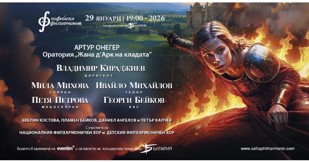 На 29 януари Софийската филхармония пише нова страница в своята история. От 19:00 ч. в зала „България" националният оркестър ще представи за първи път едно от най-необичайните и впечатляващи произведения на ХХ век – ораторията „Жана д'Арк на кладата" от Артур Онегер по текст на Пол Клодел.