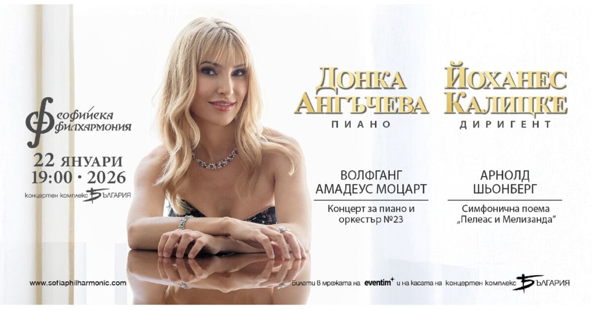 Популярната в Австрия пианистка Донка Ангъчева пристига с роял Бьозендорфер за концерта си със Софийската филхармония на 22 януари. Тя е е част от престижния кръг на артистите на прочутата марка рояли, сред които са легендарни пианисти като Андраш Шиф, Кристоф Ешенбах, Рудолф Бухбиндер, Артуро Бенедети Микеланджели, Тори Емйъс, Питър Гебриел и др. В София тя ще представи Концерт за пиано и оркестър №23 в ла мажор, К.488 от Волфганг Амадеус Моцарт под палката на маестро Йоханес Калицке. Програмата включва и и симфоничната поема „Пелеас и Мелизанда“, оп. 5 от Арнолд Шьонберг. Билети ще откриете на касата на зала "България" и в мрежата на Ивентим.
